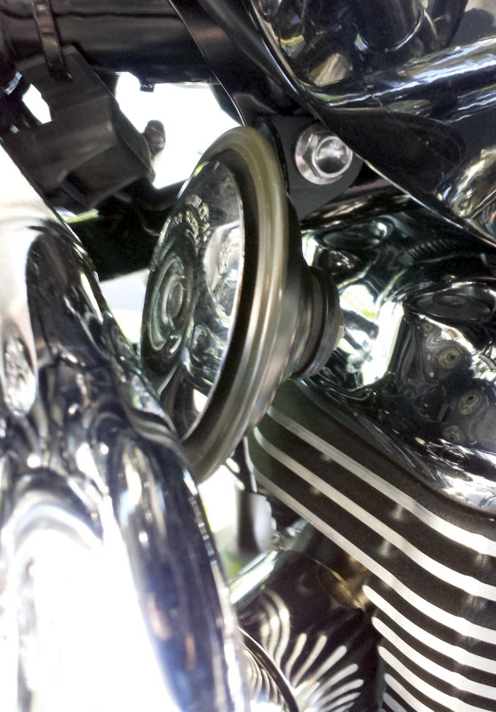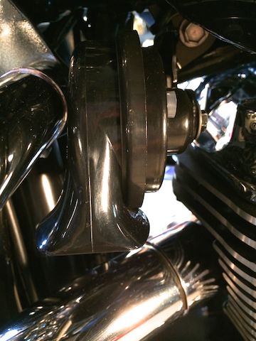 The following mounting technique requires that you've got the disc horn supplied with the front dresser bars because we're re-purposing its mounting bracket. The stock horn uses a flat bracket and the disc horn uses a right-angle bracket.