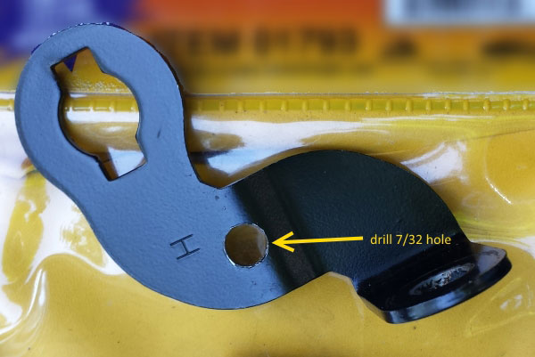 Remove the bracket from the disc horn and drill a 7/32" hole in the bracket as indicated in the photo, just at the bend in the bracket and centered.