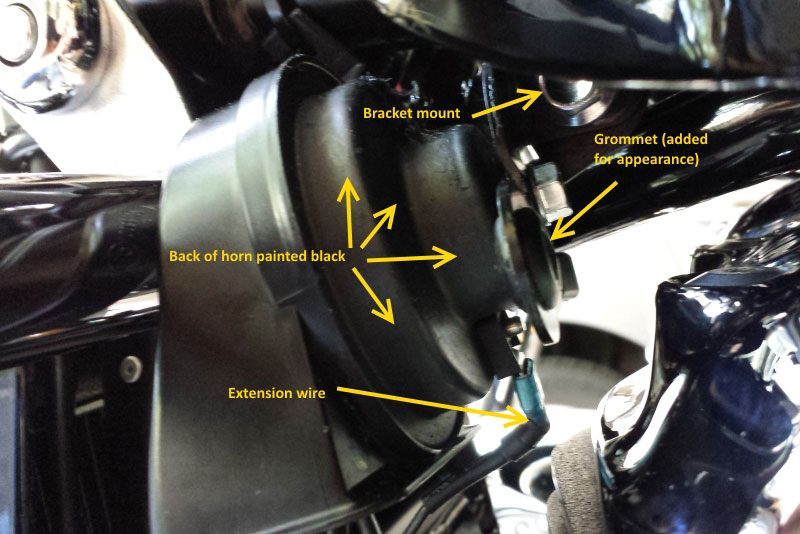 A nice quality disc horn comes with the Triumph front "dresser bars" because the stock horn won't fit in the space left by the clutch-side bar. I've seen some people say they made the stock horn fit with some persuation but short of fabricating an all new bracket, I didn't see a good way to do that and didn't want to destroy the stock bracket. I always try to make changes that are reversible back to stock.