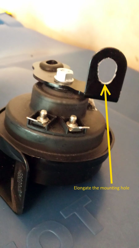 Attach the horn mounting bolt through the drilled bracket per the photo but leave the nut loose for now.