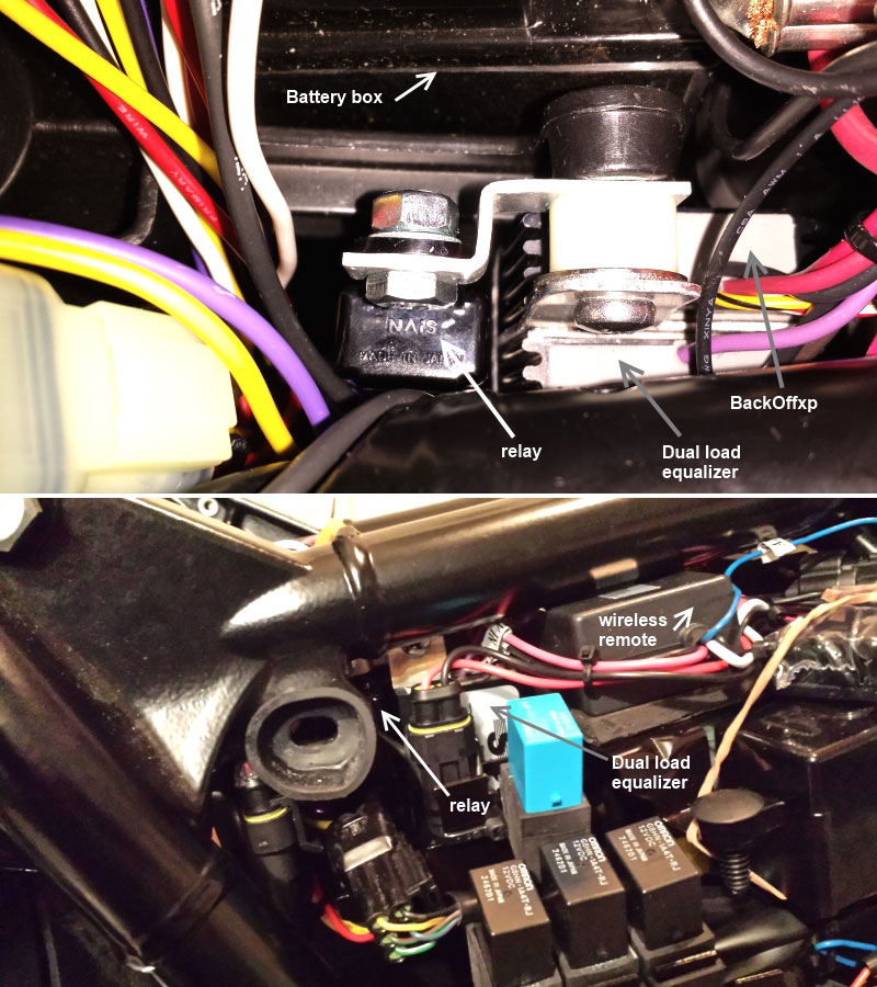 As noted before, there's not a whole lot of room in the Bird for non-Triumph add-ons but there's just enough room right next to the BackOffXP and Dual Load Equalizer modules added before. I found a small aluminum bracket (commonly found in hardware stores) that allowed mounting to the same bolt on the battery box as the module assembly. Because of the relay socket, the relay can be mounted without worrying too much about wiring; just needs enough room to accomodate the socket and a short bend of wires below it.