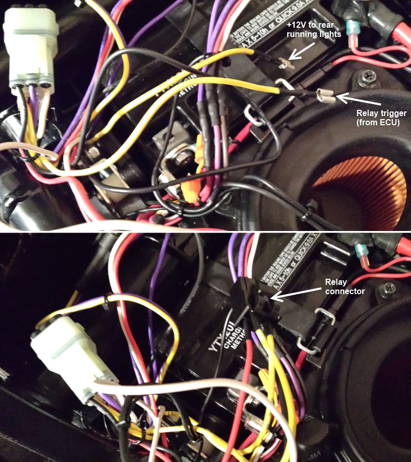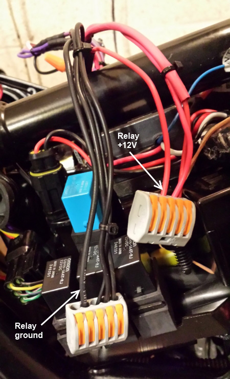 The half of the yellow wire coming from the ECU-side connector will now be used to trigger the relay, so it goes to one side of the relay coil; it doesn't matter which side. The other half of the yellow wire going to the rear lighting-side connector will now receive +12 volts from the relay contact when the relay is engaged. You need to add a ground to the other side of the relay coil so the relay trigger current has somewhere to go and of course you need a fused +12V source to the relay contact side supplying power to the rear running lights when the relay is engaged. Since I used Custom Dynamics "Magic Power Blocks" Link to supply power for a previous install ("Lighting Up Your Bird") Link that draws trivial power, picking power and ground off of these lines is literally a snap. You MUST make sure you draw power from a fused source; do not connect directly to the battery without a fuse in the line. You also don't want to use a relay whose contacts are rated less than the fused 12V line feeding it. The Magic Power Blocks are fused to handle up to 15A and the relay I used can carry 20A.