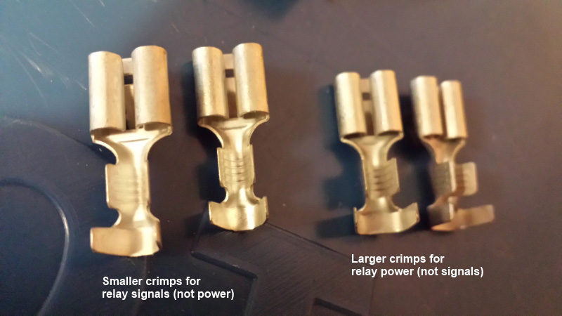 The first traumatic step is to tease out the yellow wire from our previously built harness that bridges the connectors between the ECU and the rear lighting and cut it mid-length. THIS ISN'T THE STOCK HARNESS, this is the custom harness described in the post "Turn signals become run/turn/stop plus brake light modulator"; don't cut the stock harness! The relay socket comes with a set of crimp-on quick-disconnects; the larger gauge crimps are for the +12V and ground connections and the smaller gauge crimps are for the relay coil connections. If you mix them up, in this case no one will ever know or care; it'll all still work and nothing will catch fire. They're both overkill.