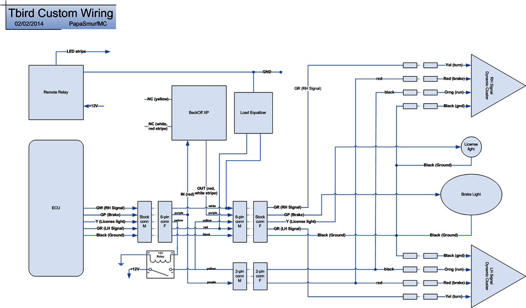 Papa, I can't tell you how much your wiring diagram has helped me and I am sure many other Bird owners out there. Thank you for sharing. It seems quite apparent that you are very knowledgeable in electrical engineering by your schematics. I purchased the license plate LED with the BackOff module and the Dual Load Equalizer. I installed this on my Bird after modifying some new hardbags which allows them to fit much closer to the bike. The bags have LED lights in them so I used them in place of the original turn signal. My dilemma is that I have had everything working perfectly in the garage with the key in the "on" position, but when I start the bike the turn signals work one time then quit. I have talked with Signal Dynamics, but haven't had any resolve yet, and was wondering seeing that you have been somewhat down this road if you have any ideas as to why this would happen. Thanks, Bob